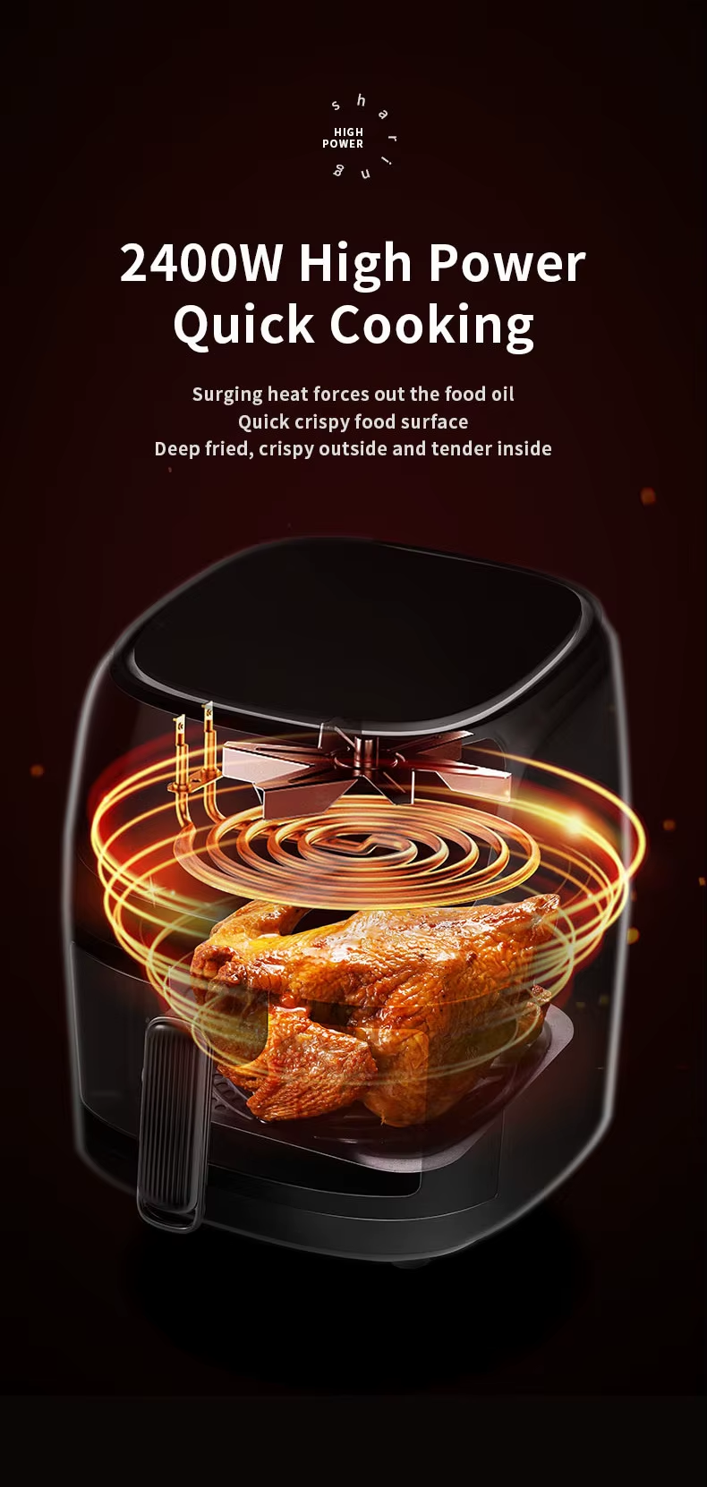 8L extra-large capacity fits 1.5kg chicken + sides—ideal for 4-6 people.